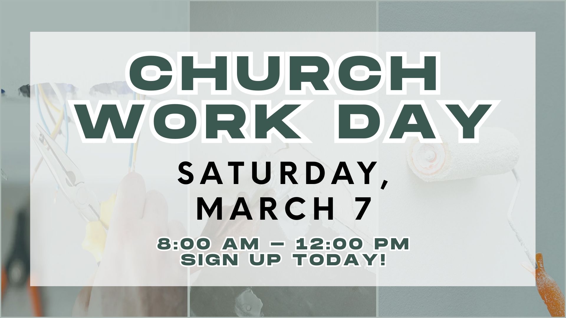 Sign up to serve at FBC on Saturday, March 7th, for the church work day! We need as many people as are willing to come out. You can select which area you feel best fit to serve in, or you can sign up to be a general volunteer and go where needed. Thank you for your willingness to serve at FBC.