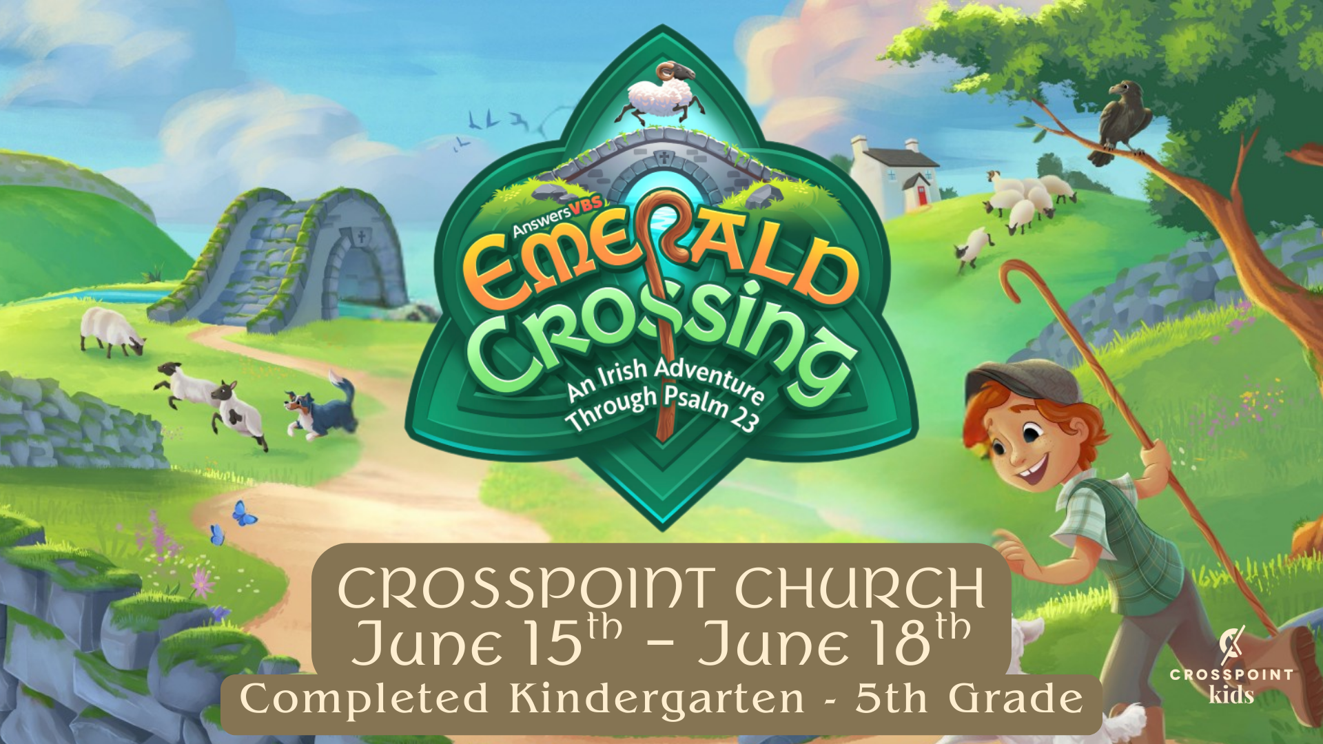 At Crosspoint VBS, your kids will journey with us to Emerald Crossing for an Irish adventure through Psalm 23. Every stop along our path will teach us about the Good Shepherd and how he cares for his sheep. So pull on your work boots, grab your walking staff, and get ready for a grand ol’ time!