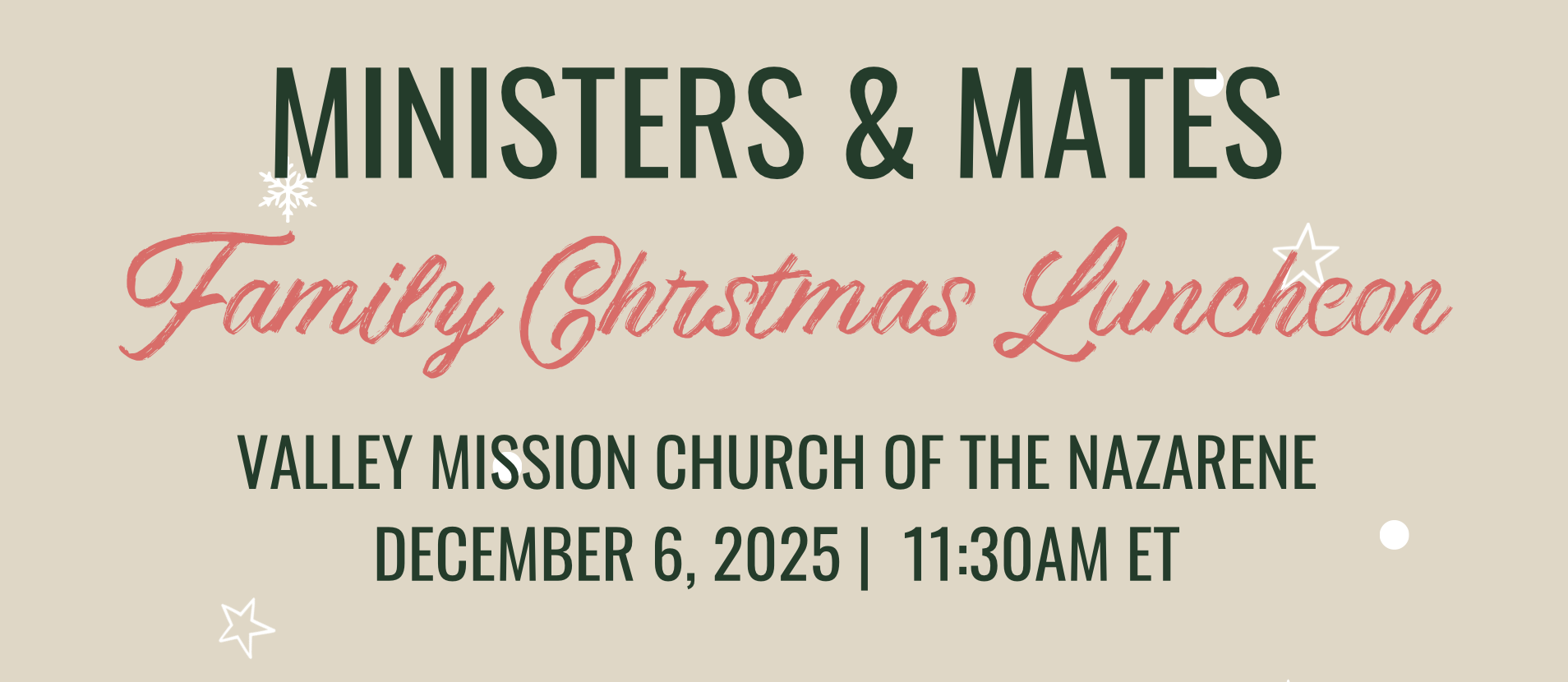 Online registration for the Family Christmas Luncheon is closed. Please contact Rev. Nathan Rogers for possible availability. nrogers@swidnazarene.org