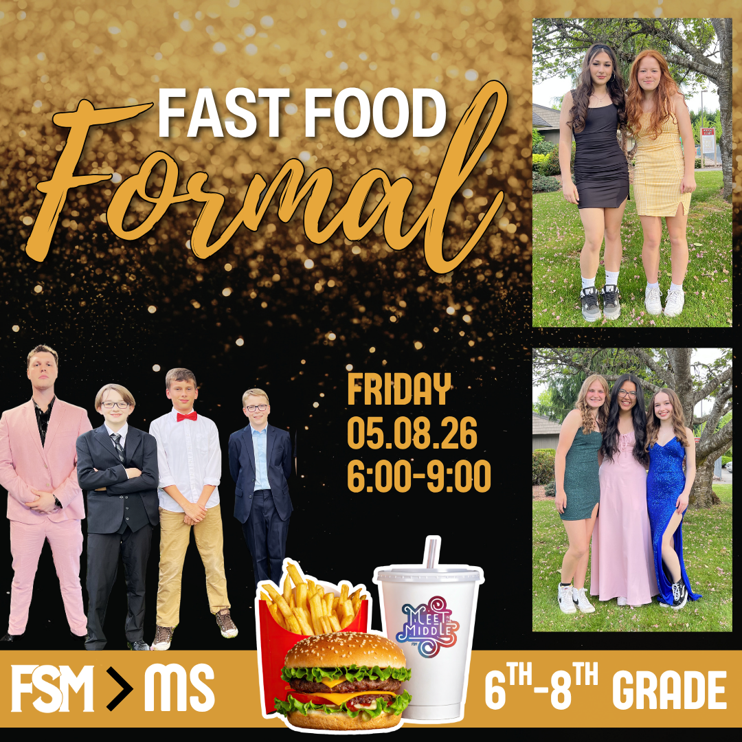 FSM's most talked about event is back, the Middle School Fast Food Formal! This is the perfect no-pressure INVITE event. Middle Schoolers invite a friend, get dressed up (for real dressed up), grab some cash (we recommend $20 to $25), and meet us at Faith. Together we'll hit the town and pig out on our favorite grub.