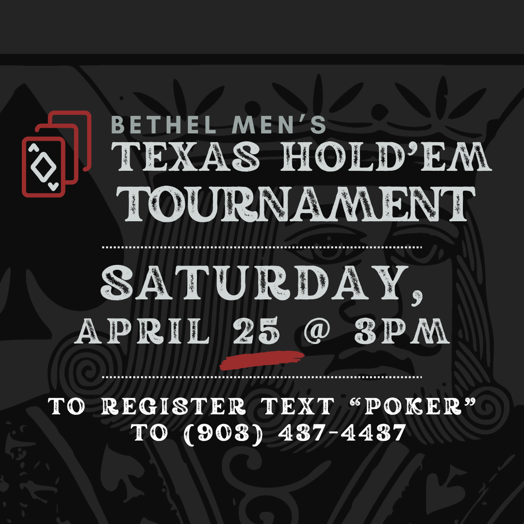 Join us for a Texas Hold'em Tournament on Saturday April 25th at 3 PM! There is an optional $20 buy-in. Winner donates proceeds to one of Bethel's local or global ministry partners. This is great way to hang out and get to know other men at Bethel.